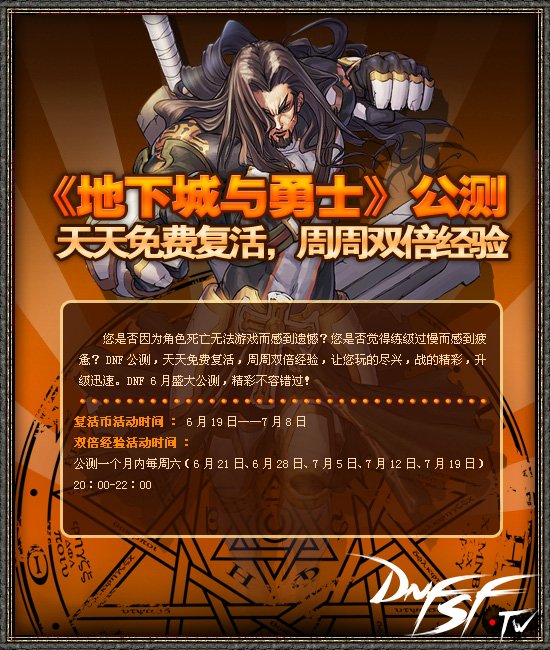 您是否因为角色死亡无法游戏而感到遗憾?您是否觉得练级过慢而感到疲惫?DNF公测,天天免费复活,周周双倍经验,让您玩的尽兴,战的精彩,升级迅速。DNF6月燃情公测,精彩不容错过!